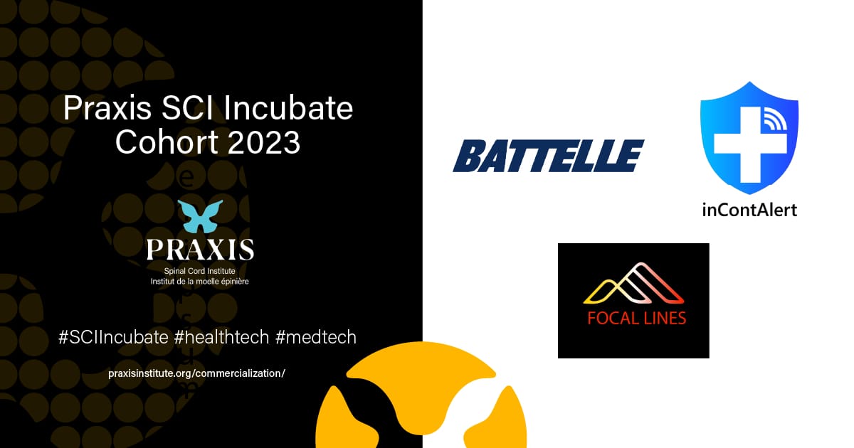 VANCOUVER, BC – February 23, 2023 – Praxis Spinal Cord Institute is pleased to announce the three transformative technologies selected as the SCI Incubate program cohort for 2023. Three companies— Battelle, inContAlert, and Focal Lines Technologies [supported under the SCI Validate program]—will take part in the four-month intensive mentoring program to accelerate innovation into commercial reality for the spinal cord injury (SCI) community.