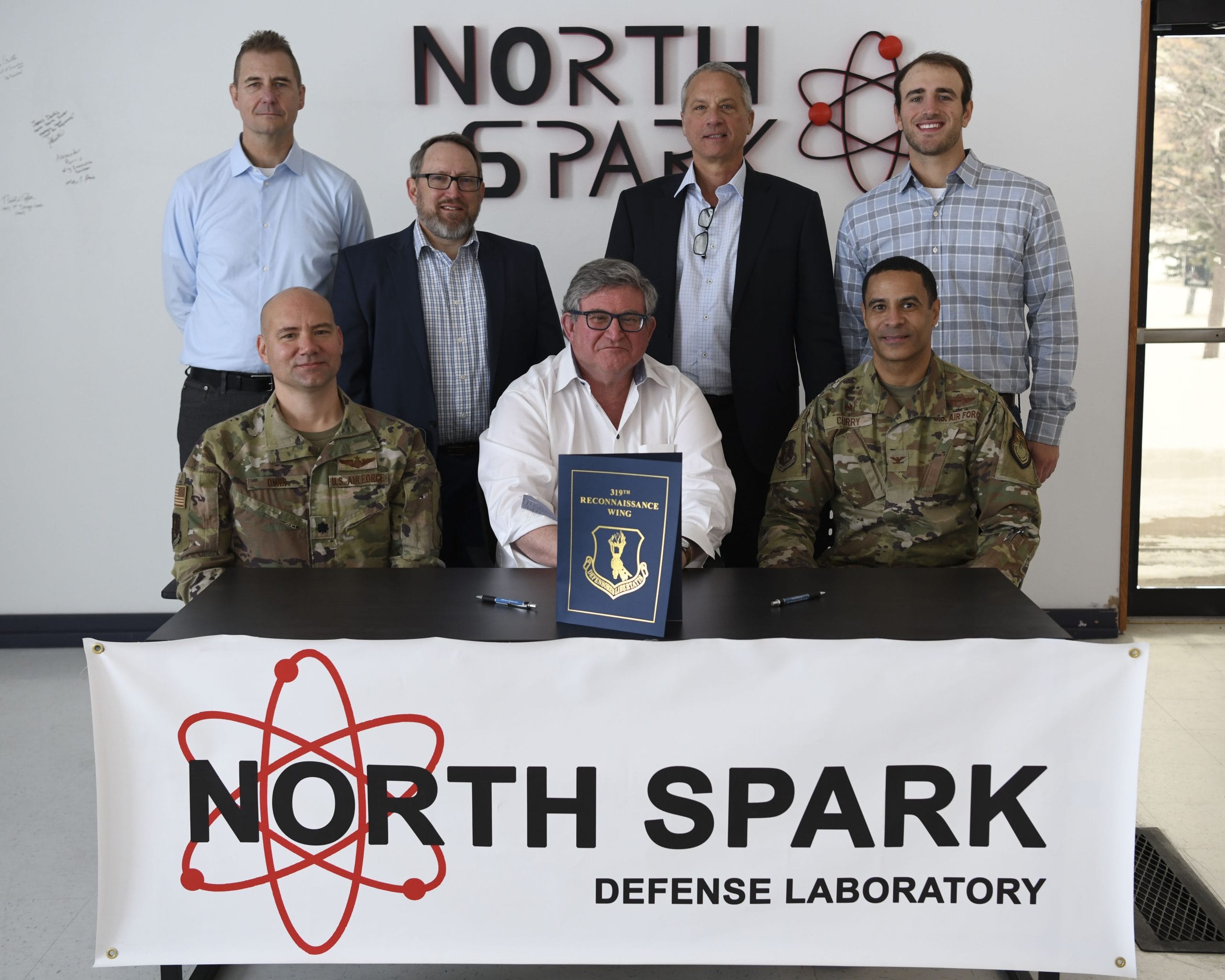 U.S. Air Force Col. Timothy Curry, 319th Reconnaissance Wing commander, the Bakken Energy Team, and the North Spark Defense Laboratory team pose for a photo Nov. 15, 2022, at the North Spark Defense Laboratory on grand Forks Air Force Base, North Dakota. Curry signed an agreement partnering with Bakken Energy to allow Grand Forks AFB to implement alternative energy solutions. (U.S. Air Force photo by Senior Airman Roxanne Belovarac)