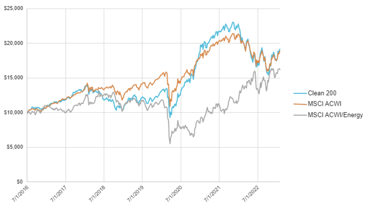 - $10,000 invested in the Clean200 on July 1, 2016, would have grown to $19,121 by Jan. 31, 2023, versus $16,131 for the MSCI ACWI/Energy benchmark for fossil fuel companies.