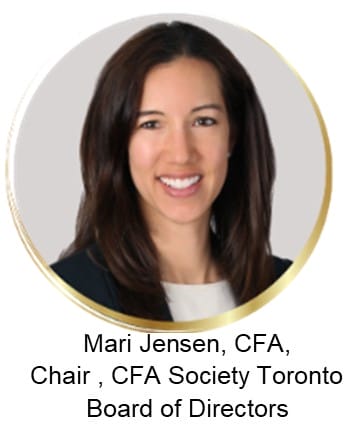 “I am honoured to serve as the Chair of CFA Society Toronto’s Board of Directors for the fiscal year 2022-2023. I continue to be highly impressed with our Board and volunteers, who balance demanding careers with their volunteer efforts for the Society – which they do with such passion and enthusiasm. I am looking forward to working with them, and with our talented staff, including CEO Fred Pinto, CFA, as we continue to execute on our Strategic Plan, which puts our members and stakeholders front and centre.” Mari Jensen, CFA.