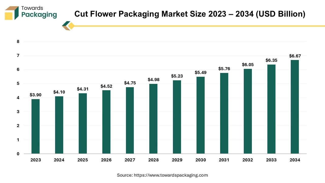 As detailed in the latest report by Towards Packaging, the global cut flower packaging market is forecast to grow from USD 4.52 billion in 2026 to about USD 6.67 billion by 2034, at a CAGR of 5% between 2025 and 2034.