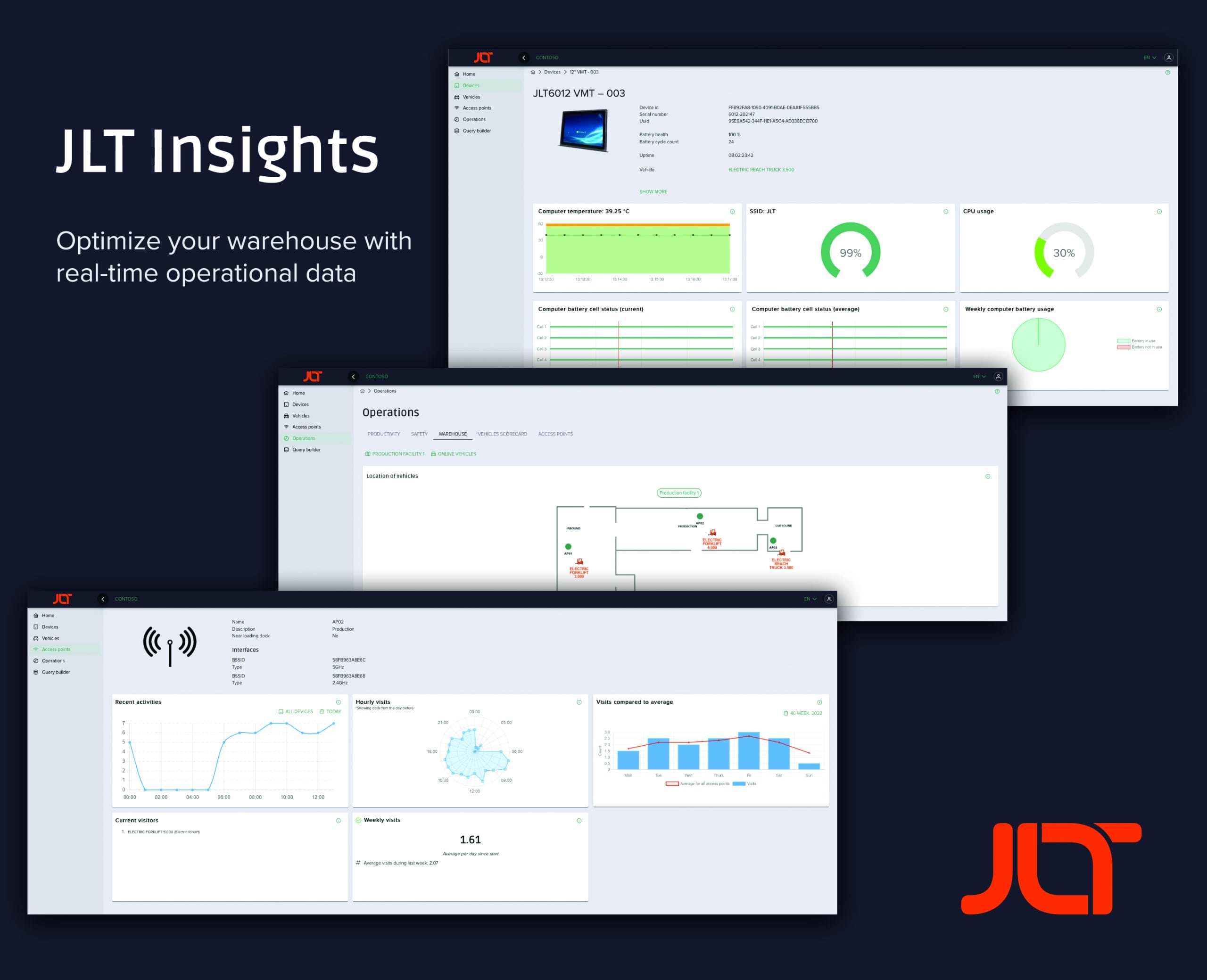 The customizable software solution enables warehouse and IT managers to monitor their vehicle-mount terminals (VMT) and to gain greater operational insights. Based on various data-points collected from within the IT device and its sensors, JLT Insights empowers customers to optimize the daily operations of their harsh work environments as well as their host vehicles.