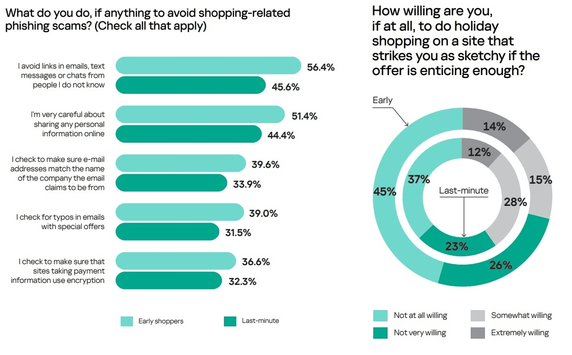 - Only 46% of last-minute shoppers avoid links in messages from people they do not know, vs. 56% of early shoppers.