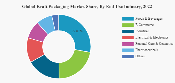 Based on packaging type, the market is segmented into boxes & cartons, bags & sacks, pouches, wraps, and others. The boxes & cartons segment is dominating the market as kraft paper boxes offer several benefits, such as high durability, superior rigidity, and eco-friendliness. These advantages make them an ideal packaging item in many industries, such as food & beverage and clothing.