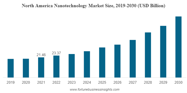 - Nanotechnology market size in North America was USD 23.37 billion in 2022