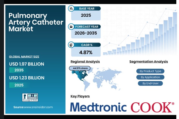 Austin, Feb. 17, 2026 (GLOBE NEWSWIRE) — According to SNS Insider, The Pulmonary Artery Catheter Market size is valued at USD 1.23 Billion in 2025 and is projected to reach USD 1.97 Billion by 2035, growing at a CAGR of 4.87% during 2026–2035. Increasing critical care procedures, rising cardiovascular disease prevalence, expanding ICU capacities, and growing demand for precise hemodynamic monitoring are key factors driving growth during 2026–2035.