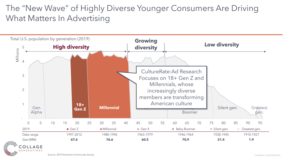 With CultureRate:Ad and Brand, Collage Group provides competitive rankings of all top brands and ads in every major category. The CultureRate database is the largest of its kind available, growing annually by over 200,000 responses or 30 million unique datapoints. Through a deep oversample of diverse Americans, brand leaders can access rich insight into how consumers process brands and ads across race and ethnicity, generation, sexual orientation, and gender. Brand leaders apply the findings from CultureRate:Ad and CultureRate:Brand to build Cultural Fluency, the capability to drive total market growth from inclusive, diverse-led marketing.
