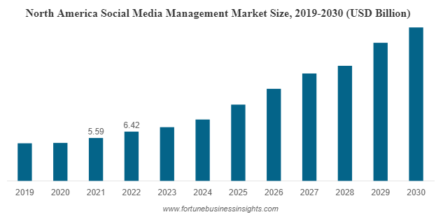 - Social media management market size in North America was USD 6.42 billion in 2022